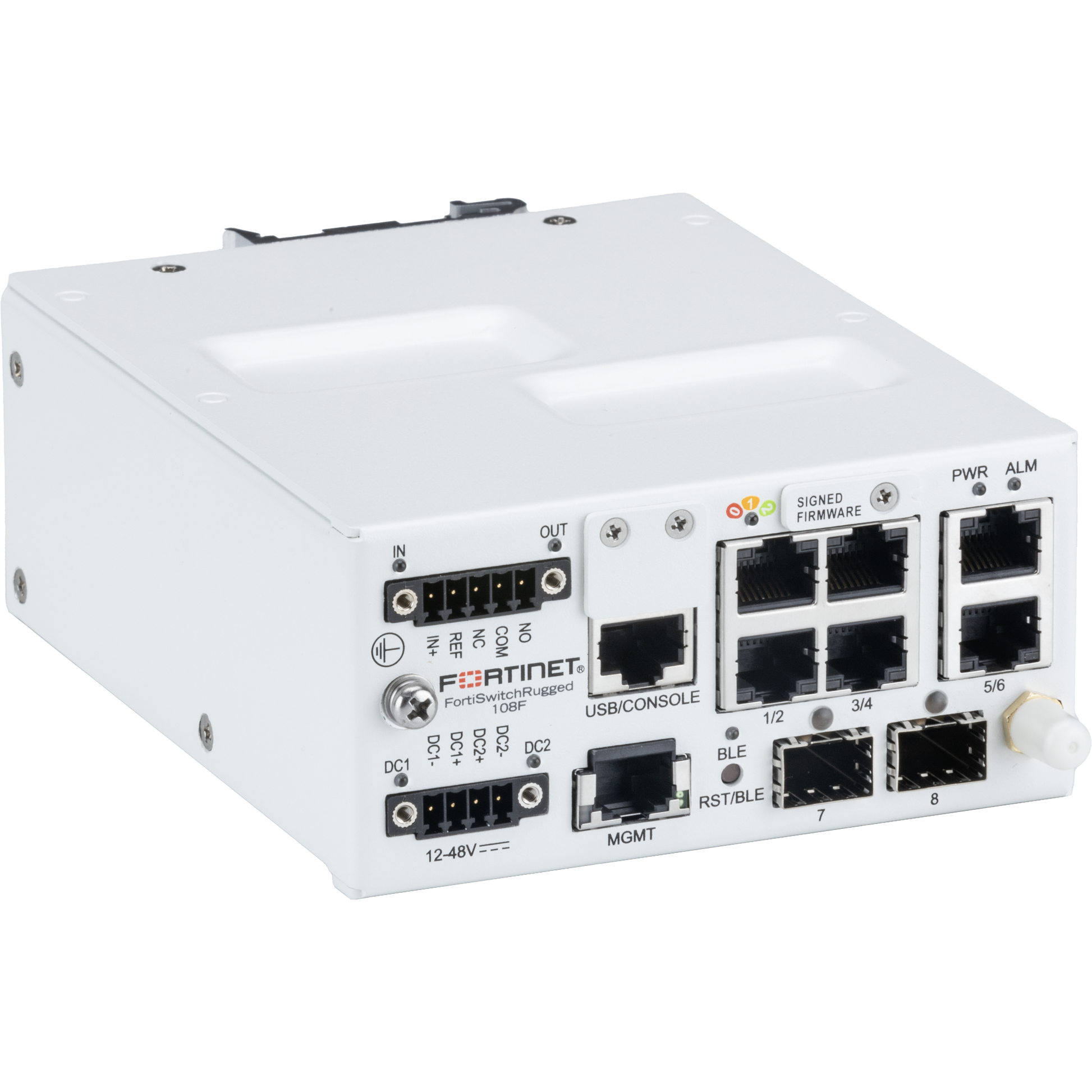 FortiSwitchRugged-108F Layer 2 ruggedized FortiGate switch controller compatible switch with 6x 1GE/100M/10M RJ45 and 2x 1GE/100M SFP. IP40 rating. [FSR-108F]