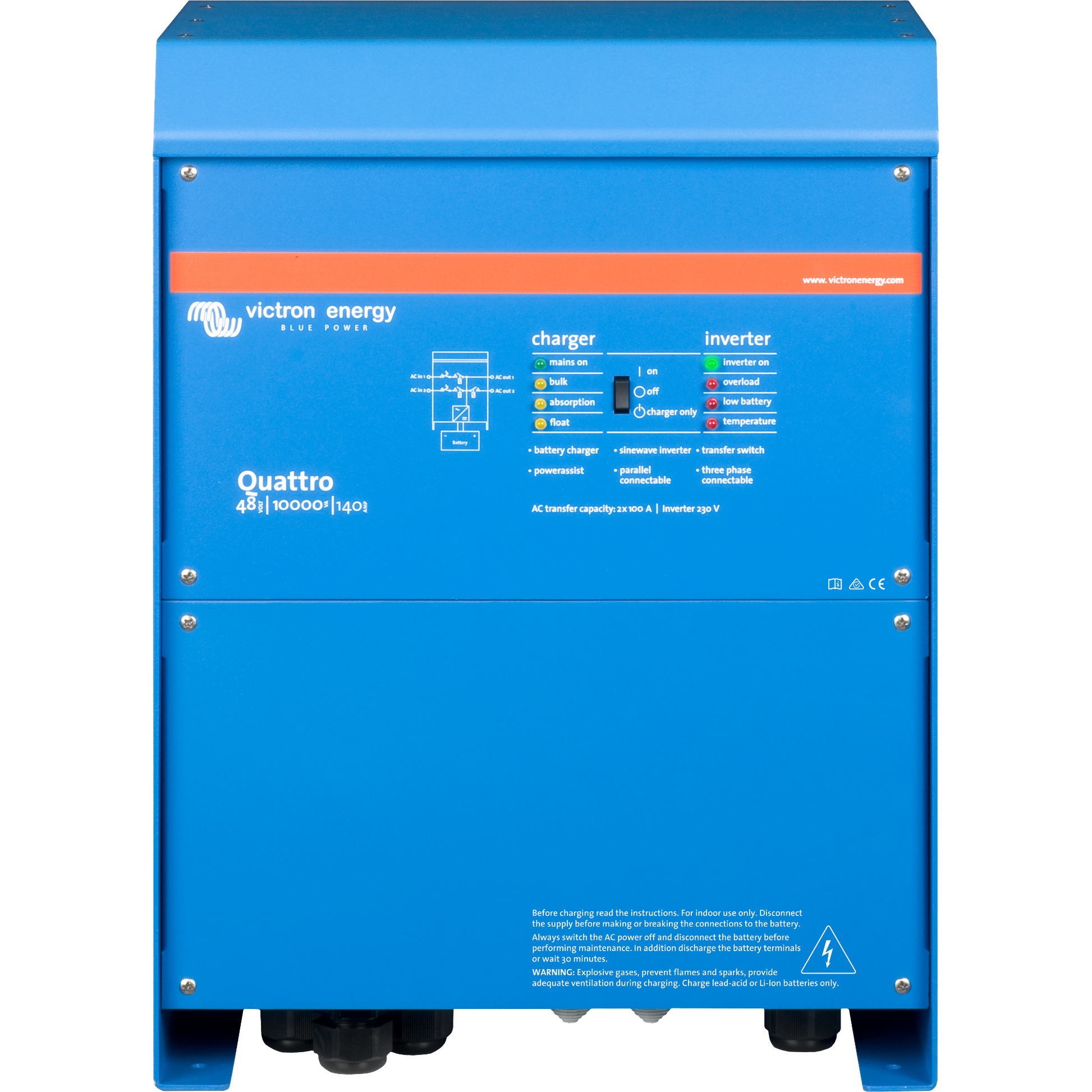 Similar to the MultiPlus, the Quattro 48/10000/140-100/100 is also a combined inverter and charger. Additionally it can accept two AC inputs and automatically connect to the active source. Its many features include a true sine wave inverter, adaptive charging, hybrid PowerAssist technology plus multiple system integration features such as three or split phase operation and parallel operation.